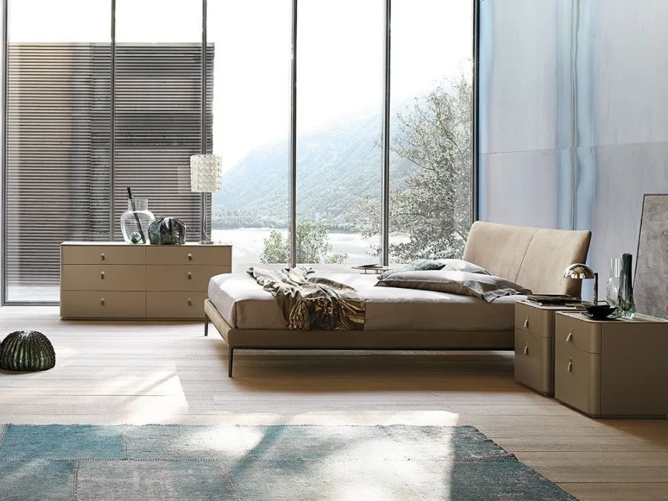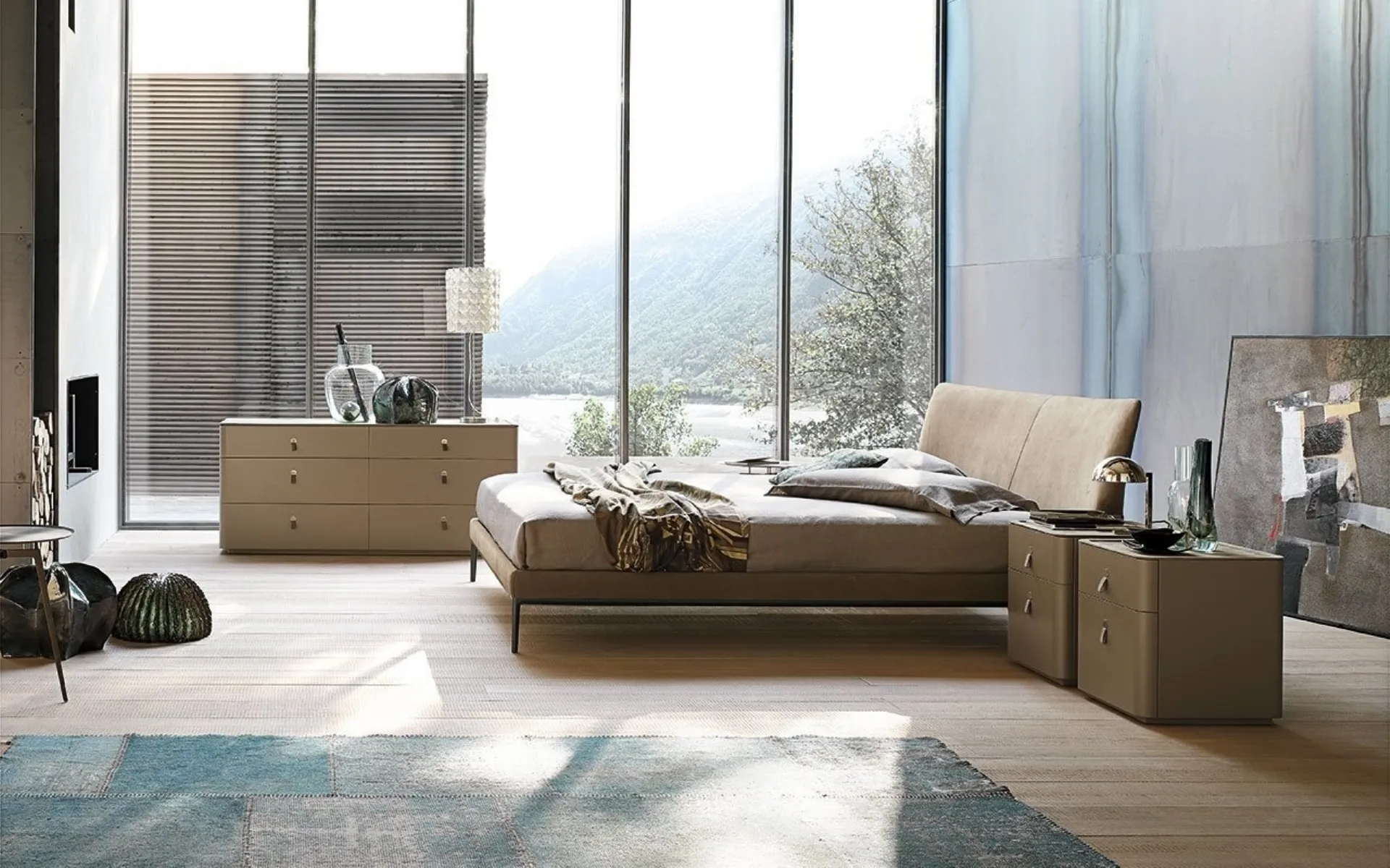 The Maya bed with headboard by Alivar enhances the sleeping area, ensuring you the deepest sleep an