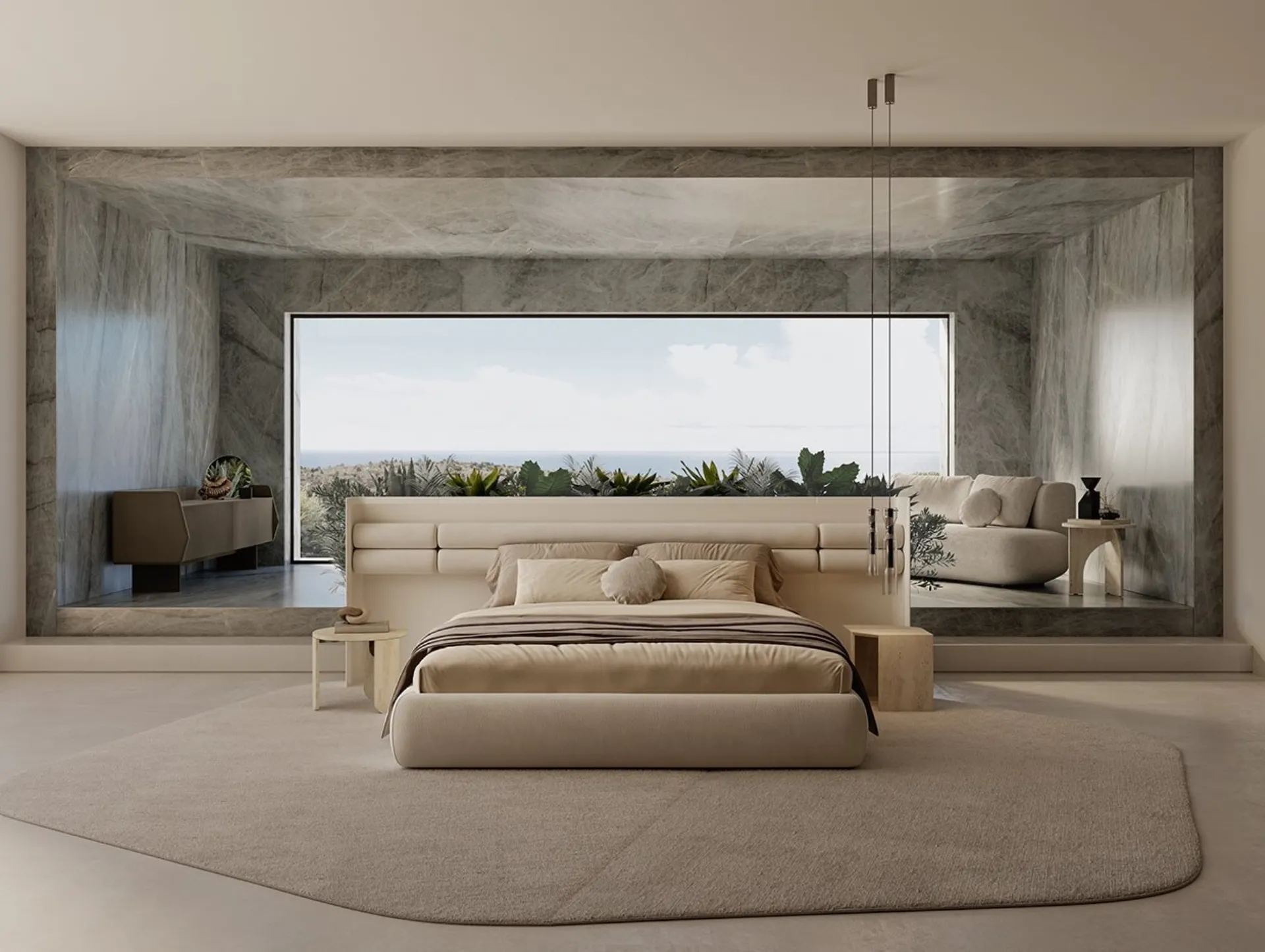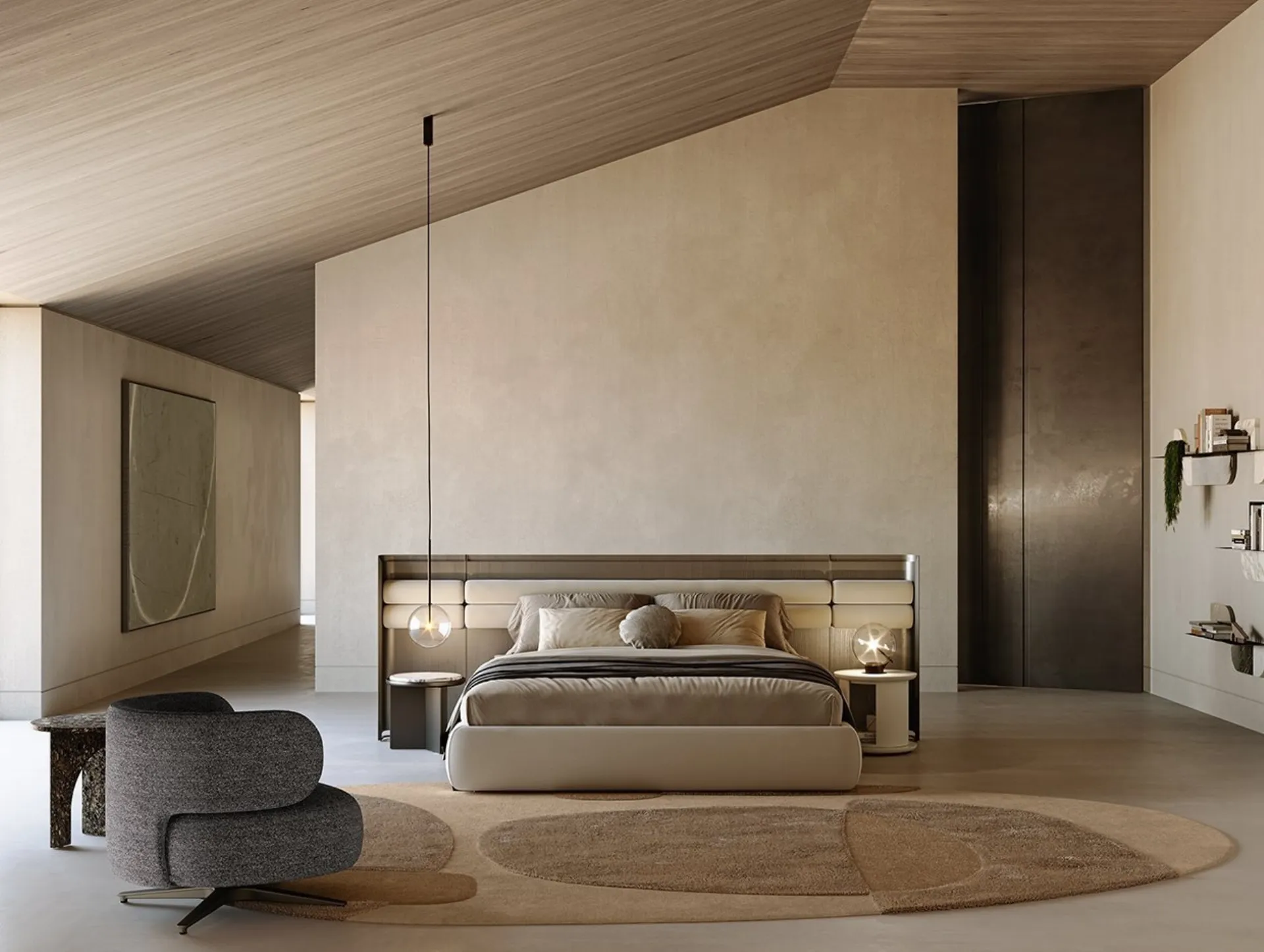 The Sunrise wooden and leather bed by Gallotti&Radice enhances the bedroom, ensuring total rela