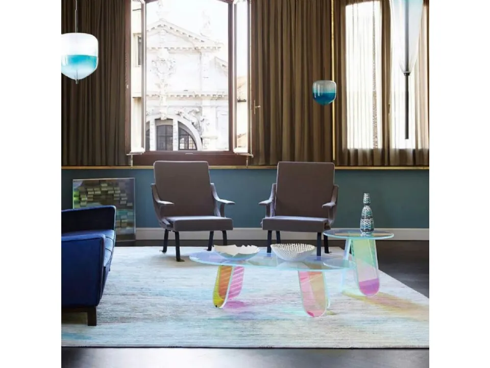 The charming furnishing compositions of the Glas Italia brand personalize the environment with their colors and style, recreating particular furnishing atmospheres. Very versatile and multifunctional, the glass design complements fulfill different functions: they enhance the practicality and aesthetics of the room. In our store, you will be able to experience the excellence of the glass design coffee table models from this brand, just like this proposal in the picture. Glas Italia's Shimmer glass coffee table will add character and charm to an interior furnished with furniture and accessory elements with design references. Complements and coffee tables complete the home furnishing, occupying the space in a useful way and making it highly functional and aesthetically valuable.