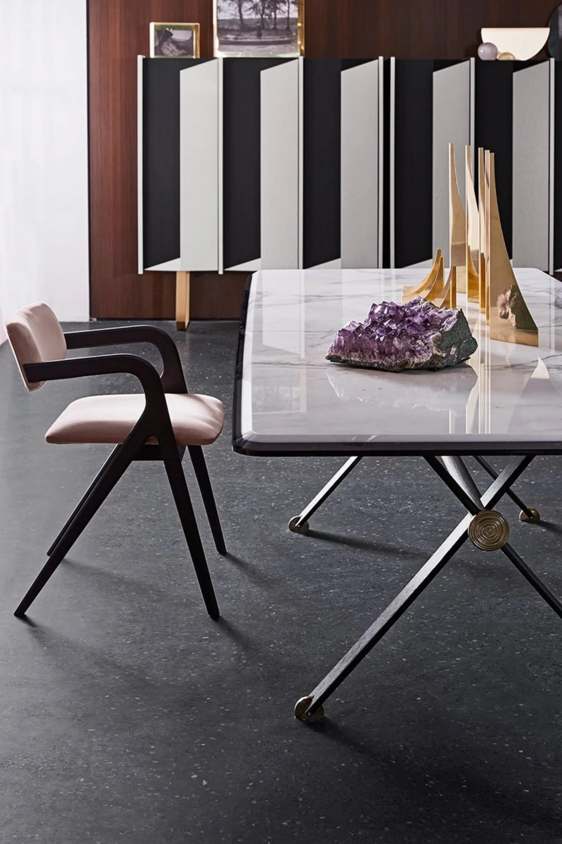 If you want a dining table with high aesthetic content, contact us and receive information and quotes on the model shown in the photo. Maat table by Gallotti&Radice: made with premium materials, it is characterized by the sharp lines of the tabletop and an elegant and sophisticated base. The renowned brand Gallotti&Radice, a leader in marble furniture production, has chosen an infinite variety of finishes, shapes, and shades for its line. Ideal for creating unique combinations with modern chairs and accessories, the company's fixed tables are among the most exclusive solutions on the market, perfect for the living room and kitchen area. A model like the one in the photograph, combined with the right chairs, will enhance the look of the rooms in the home dedicated to hospitality.