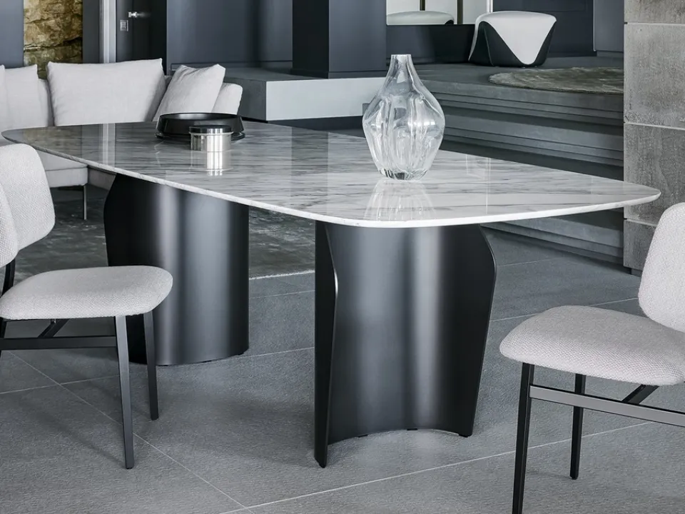 If you want a high-design dining table, contact us and receive information and quotes on the model shown in the photo. Ideal for creating unique combinations with seating and design accessories, the fixed tables of the brand are among the most original solutions on the market, perfect for the living room and kitchen. The well-known and renowned brand Bonaldo, specializing in marble furniture, has chosen an infinity of materials, lines, and colors for its collection. Bonaldo's Flame Marble Table: made of precious materials, it is characterized by the bold shapes of the top and an elegant and sophisticated base.