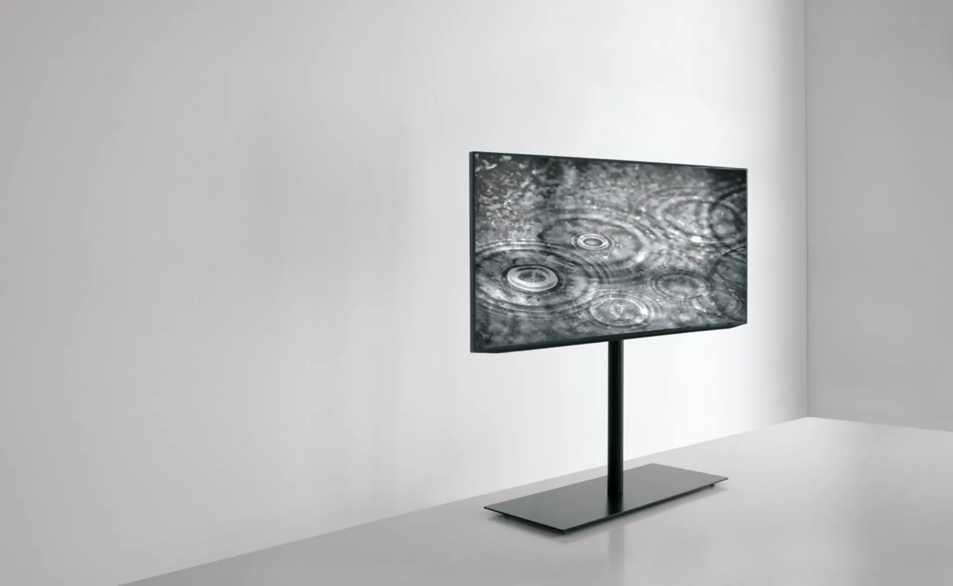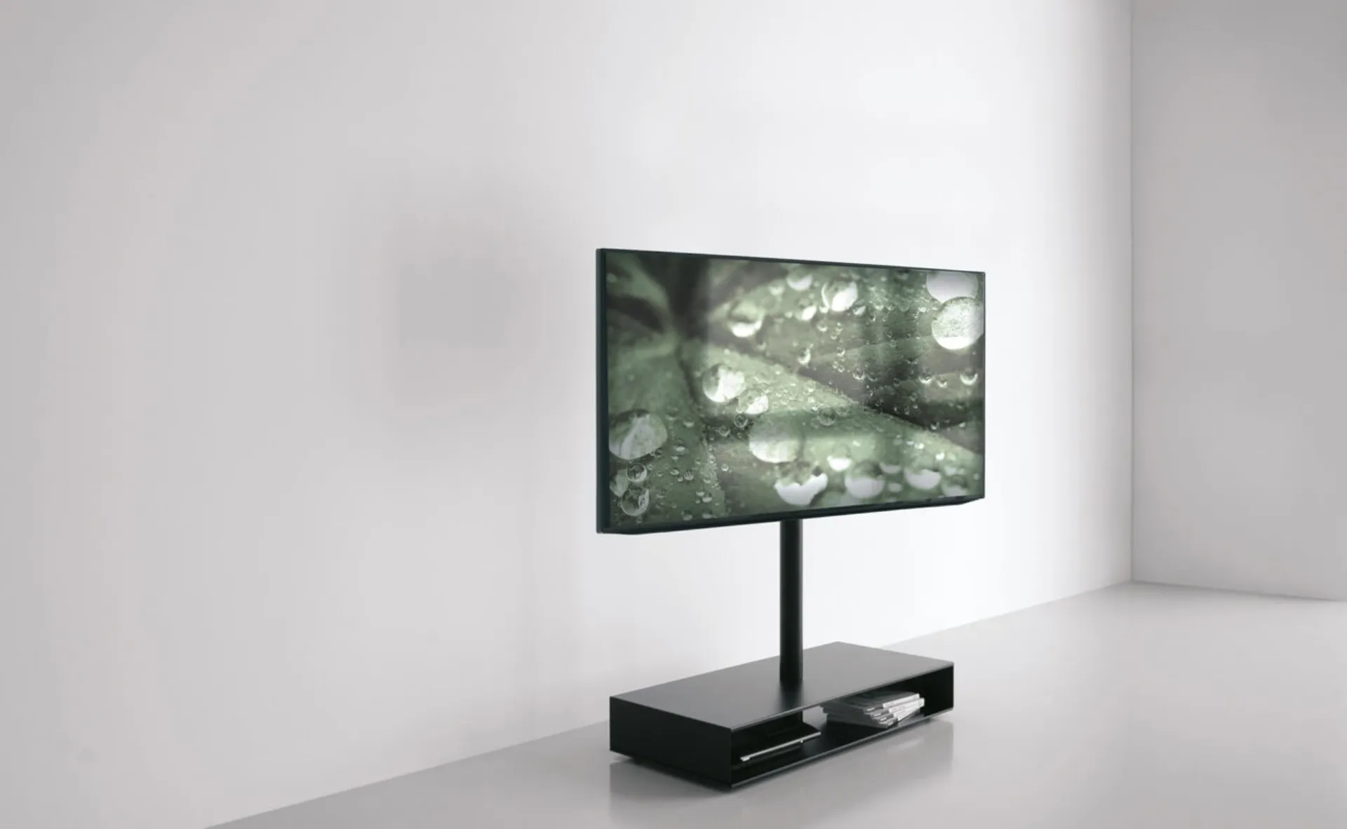 The Mobile TV Stand Spin 360 configuration 01 by Extendo is suitable to be placed in different types of living rooms, thanks to its refined style and great functionality. Extendo offers various types of modern TV stands, turning the walls of the living area into a beautiful and well-organized space with great aesthetic value. TV stands are multi-functional furniture pieces and only with the help of a good model of stand can the living room be perfectly organized. This solution with a metal TV stand, among Extendo's most exclusive proposals, is ideal for furnishing a charming living room.